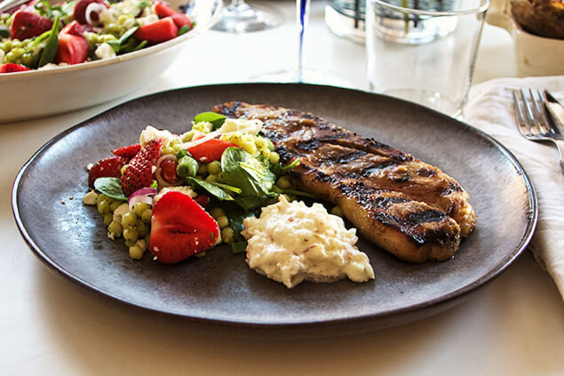 Äppelmarinerade bogbladskotletter med äppeltzatziki och pärlcouscoussallad