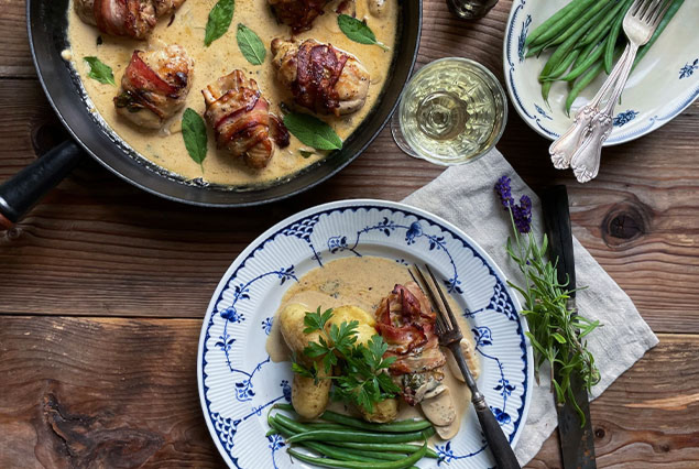 - Pensla lårfiléerna med senap och fördela salviabladen över lårbitarna. Lägg en liten kvist rosmarin på varje och vira en baconskiva runt.