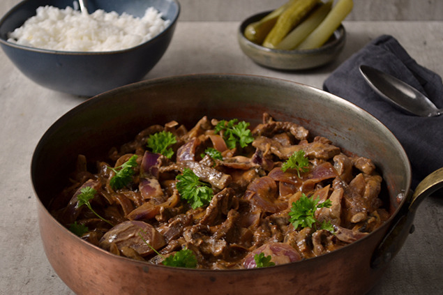 - Skiva innanlåret i tunna strimlor, stek lite i taget i en het panna, lägg det stekta åt sidan på en tallrik.