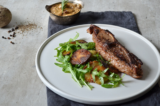 - När köttet är genomstekt (temperatur 72 grader) så tar du av dom och låter vila, låt potatisen gå ett par minuter till.