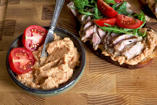 - Grovhacka soltorkade tomater och vitlök och blanda med bönorna, olivoljan och vattnet. Mixa till en slät röra och smaka av med salt och peppar. Om röran blir för tjock och inte går att mixa kan du tillsätta mer vatten.
