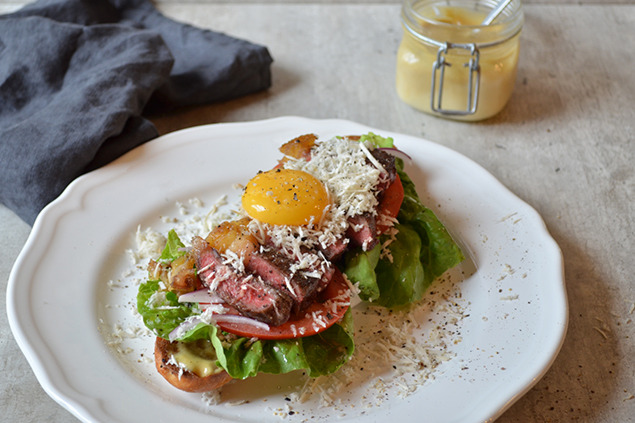 Skiva dina grönsaker separera äggvitan från gulan och riv pepparroten. Skiva tillsist köttet och montera ihop din smörgås.