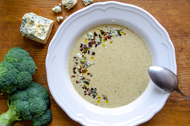 Broccolisoppa med knaprigt bacon och ädelost