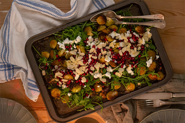 - När brysselkålen är klar blandar du den med ruccolan på plåten. Toppa med smulad chevre, baconsmul, granatäppelkärnor och mandelspån.
