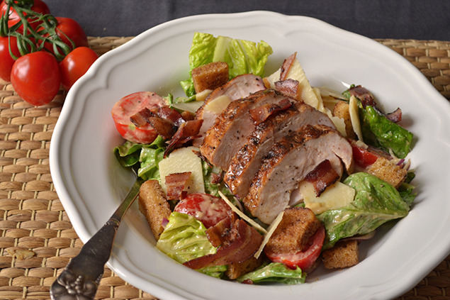Skiva alla grönsaker och lägg i en skål. När krutongerna och baconet fått fin färg blandar du upp salladen med dressingen och toppar med kyckling, krutonger och bacon.