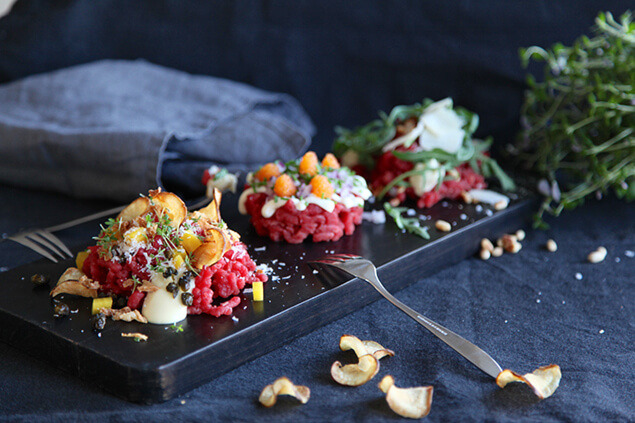 1. Lägg det malda köttet som ett berg på en tallrik, strö lite havssalt över.
