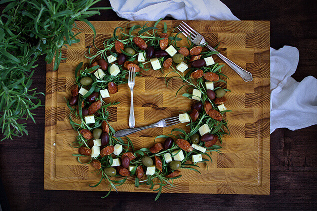 - Fördela ostkuber, korvslantar, oliver och brödbitar runt kransen. Här kan du pilla hur länge som helst, men kom ihåg att kransen är till för att demoleras så småningom!