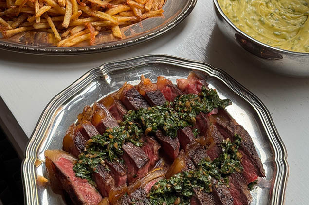 Servera clubsteaken skuren i skivor tillsammans med krispiga pommes, chimichurri, jalapeñobea och den syrliga salladen. En festmåltid på riktigt!