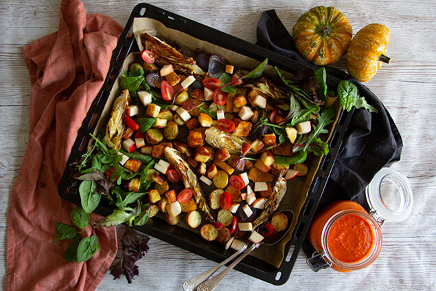 - När plåten är klar toppar du den med småbladssallad, tomater, äpple och den stekta eldosten. Servera tillsammans med romescosås och kanske ett gott bröd!