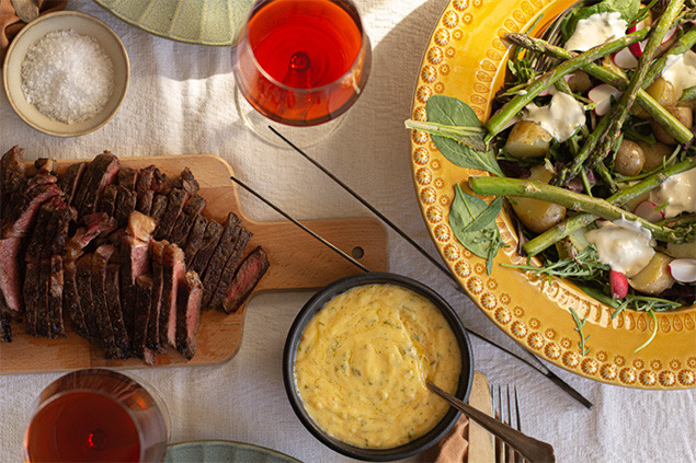 - Stek köttet 2–3 minuter per sida i het stekpanna med olja i. Lägg gärna i en klick smör mot slutet och ös köttet med. Låt vila ett par minuter innan du skär upp och serverar.