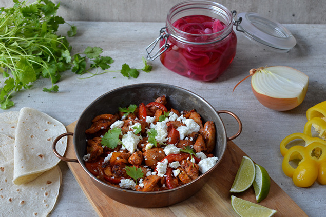 Smula fetaosten, klyfta limen, hacka koriander och ät allt tillsammans med varma tortillabröd.