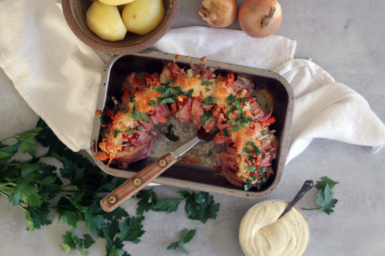 Ugnsbakad falukorv med bacon och senapskräm