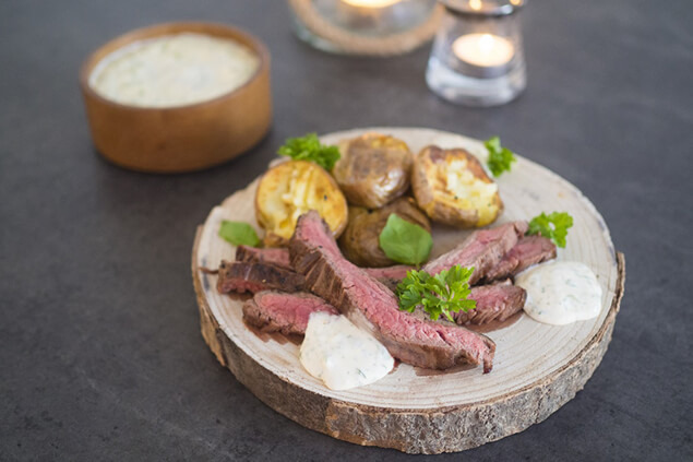 Flankstek med krossad potatis och syrlig örtkram