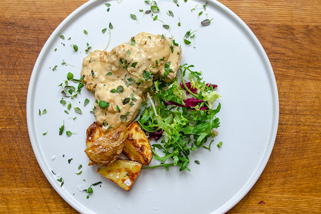 Servera med rostad potatis, sallad och ett par kvistar färsk timjan.
