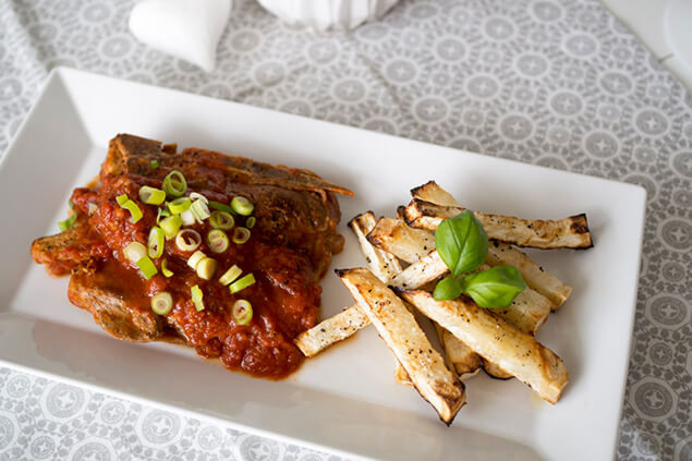 - Skala rotsellerin och skär i stavar. Lägg i en ugnssäker form och ringla över olivolja och krydda med salt och svartpeppar. Ställ in ugnen ca 20-25 minuter.