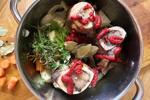 - Börja med att rosta märgbenen. Lägg dem på en plåt med bakplåtspapper och klicka ut tomatpuré ovanpå så rostar du den samtidigt. Rosta i ugn på 200 grader i 15-20 min, de ska inte få för mycket färg.