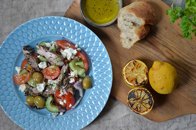 Skiva upp kycklingen och servera tillsammans med din grekiska sallad och gärna lite bröd att doppa i oljan!