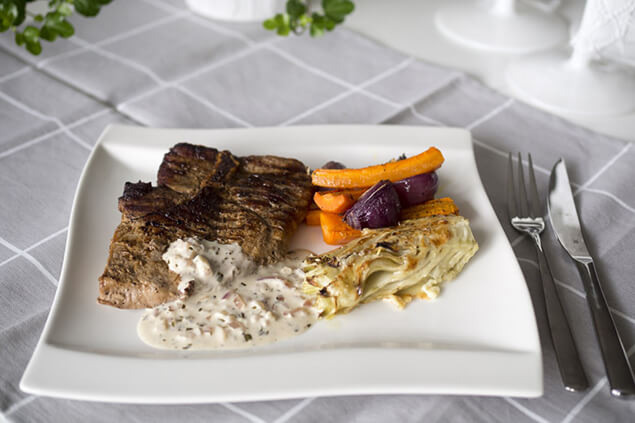 Grillad bogbladskotlett med gratinerad fänkål och dragonsås