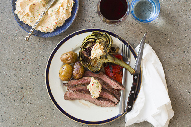 - Låt köttet vila 5-10 minuter. Skiva upp det mot fibrerna och servera med grillade kronärtskockor, paprika och syrligt koriandersmör.
