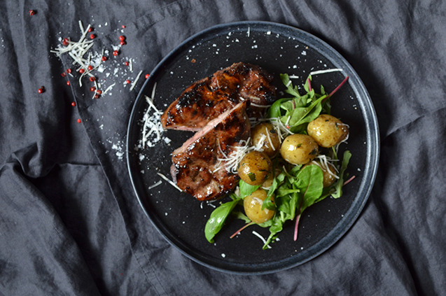 Grillad fläskkarré med färskpotatis och parmesan
