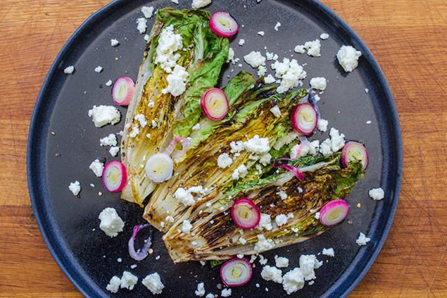 Lägg den grillade gemsalladen på ett fat, pressa över lite citron, smula över fetaost och strö över syrad lök. Salta och peppra.
