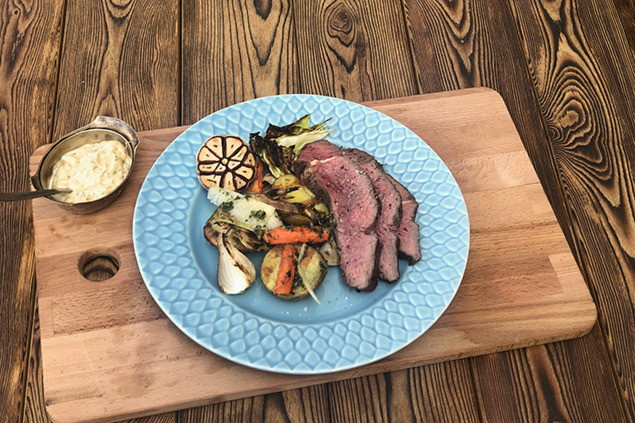 Lägg på köttet en vända till på den heta grillen ca 1.30 på varje sida så den får en fin yta. Skär sedan upp köttet och servera tillsammans med dragonmajonäs och potatissalladen.