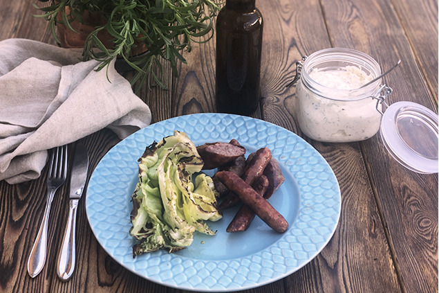 Grillade korvar med fetaostkräm och spetskål