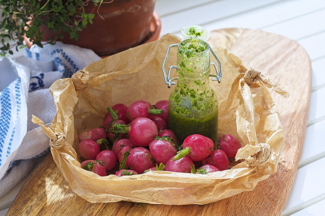 5. När rädisorna är färdiga ringlar du oljan över och serverar dem ljumna.