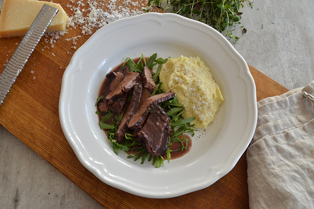 Grisflank bräserad i rödvin med parmesan och potatispuré