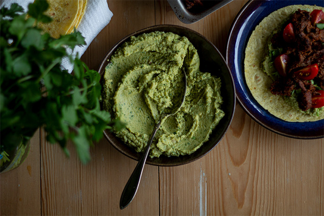 - Mixa kikärtorna med avokado, vitlök, koriander och juice från en lime. Om röran blir för tjock kan du spä med vatten till önskad konsistens.