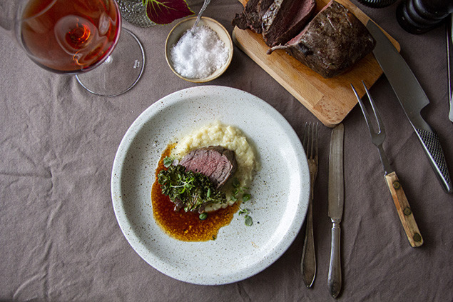 Skiva upp och servera hjortfilén med rotselleripuré, rödvinssås och krispiga grönkålschips!