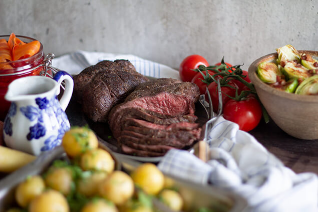 - Ta ut steken när den nått ca 58 grader. Låt den sedan ligga på ett fat som lutar i minst 15 minuter innan du skär upp den i tunna skivor. Viktigt här är att skära mot fibrernas riktning - annars riskerar köttet att upplevas som segt och trådigt.