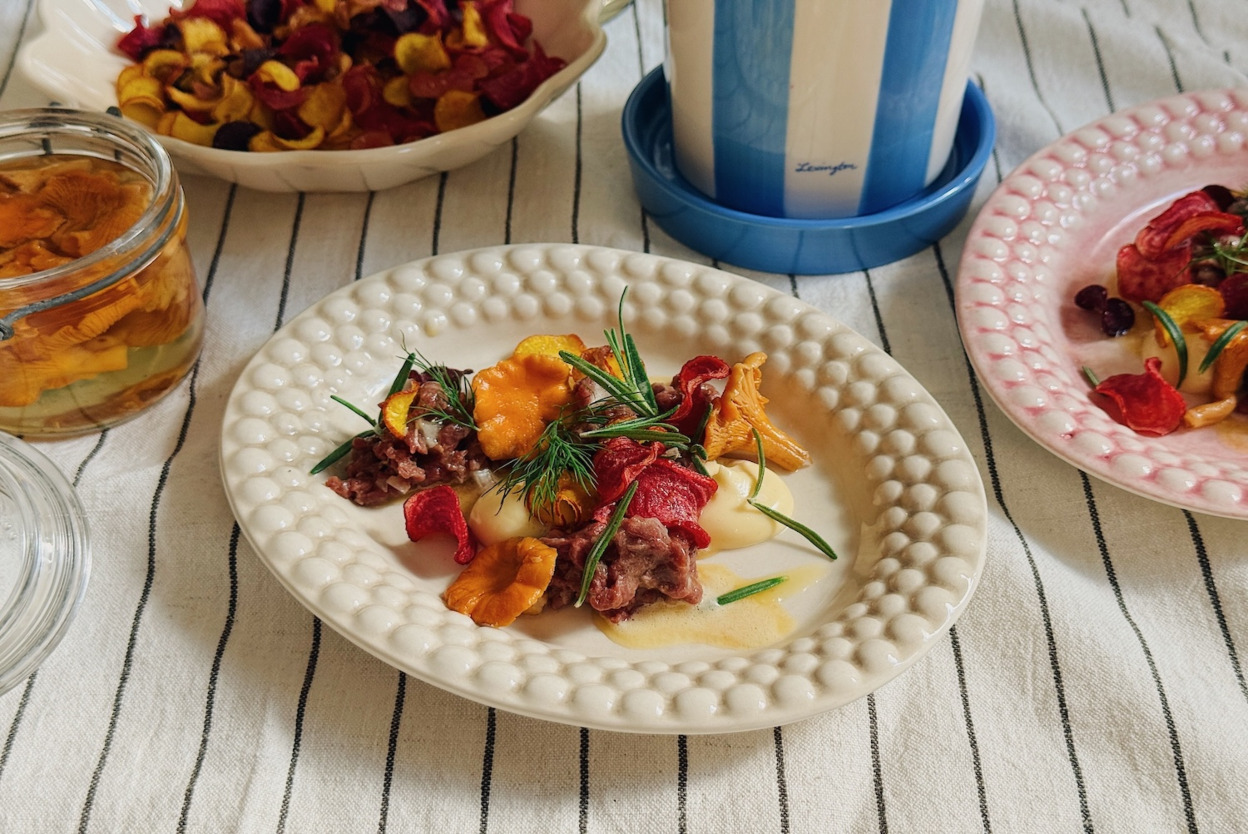 Recept på hjorttartar med Västerbottenost, tryffel, picklade kantareller och brynt smör. En smakrik förrätt med fin balans mellan syra, sälta och umami.