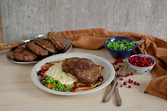 - Blanda hjortfärsen med äggulorna och vispgrädden, ta lite i taget tills du har en lös smet – den ska vara så att du precis kan forma den till biffar. Krydda med salt och peppar.