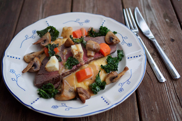 - Skär köttet i tunna skivor och servera med polentan, rotfrukterna, såsen och svampfräset.