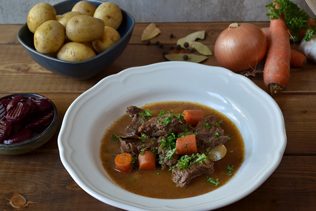 Blir grytan lite simmig? Då kan du reda den. Blanda 1 msk vetemjöl i lite vatten så det inte blir några klumpar, och vispa ner i grytan samtidigt som du låter den koka upp. Servera med potatis, rödbetor och hackad persilja.