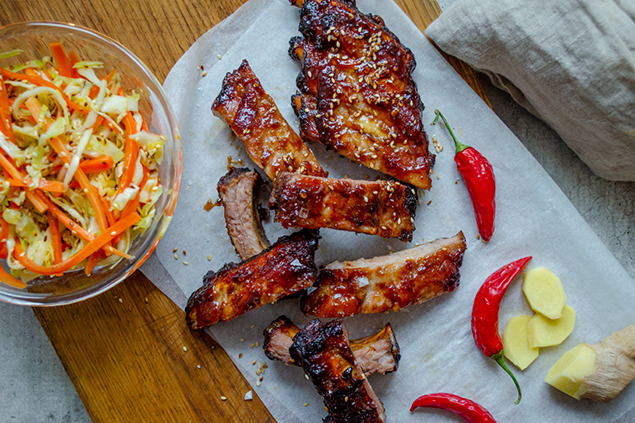 Hoisinglaserade kamben med syrlig kålsallad