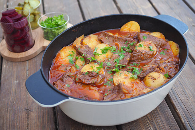 - Varva potatis, lök och kött i en gryta och krydda med salt, svartpeppar och timjan. Tillsätt lagerblad och avsluta med att hälla på såsen. Låt puttra under lock ca 45 minuter.