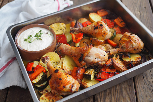 Blanda därefter kycklingen med den sista marinaden och lägg ovanpå rotfrukterna. Salta och peppra och sätt in i ugnen ca 30 minuter.