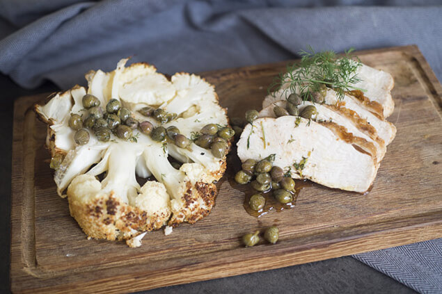 Kycklingfilé med helrostad blomkål och brynt kaprissmör