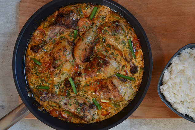 Hacka under lök och vitlök, blanda ner i kycklingen tillsammans med vitt vin, sambal oelek och tomatpure, låt sjuda ca 2-3 minuter.