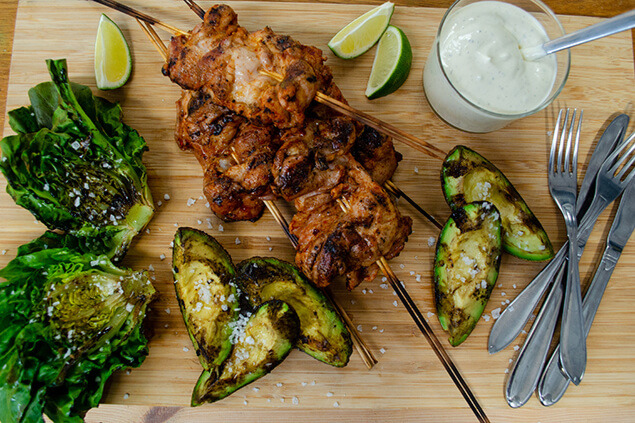 - Servera kycklingspetten tillsammans med de grillade grönsakerna, som du kan strö havssalt över, och limeyoghurten.