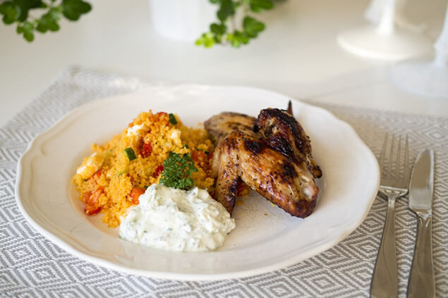 - Blanda yoghurten med pressad vitlök, grovt riven gurka (pressa gärna ur vattnet) samt finhackade örter. Smaka av med salt och svartpeppar.