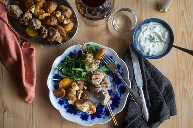 Pressa lite citron och strö oregano över spetten och servera sedan med potatis och förslagsvis tzatziki.