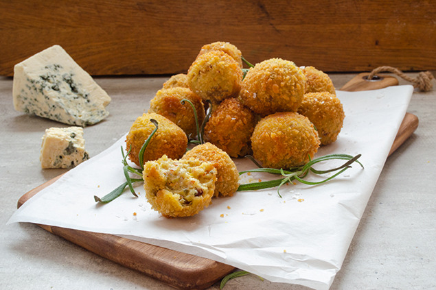Skala och mosa potatisen ordentligt i en skål. Tillsätt ägg, mjöl, smulad ädelost, bacon, salt och peppar.