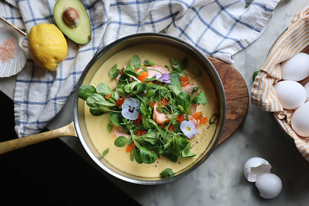 - Smörj en ugnsfast form med smör, låt det smör som blir över ligga kvar i botten av formen. Häll på äggsmeten och låt stå i mitten av ugnen i 20 min. De 10 första minuterna utan lock, när halva tiden har gått lägger jag på locket (detta för att bevara den silkeslena ytan). Kör du i en vanlig ugnsform kan du bara lägga på ugnsfolie efter halva tiden.