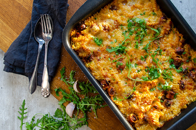 Toppa allt med ost och ströbröd, stoppa in i ugnen ca 10 minuter eller tills du får en gyllenbrun fin färg.