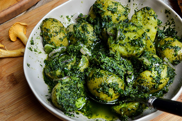 - Skiva den i halvor eller mindre bitar. Blanda ihop med peston och skivad schalottenlök.
