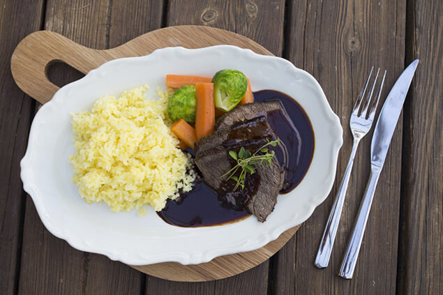 - Pressa potatisen och servera den med köttet, smörslungade grönsaker och såsen.