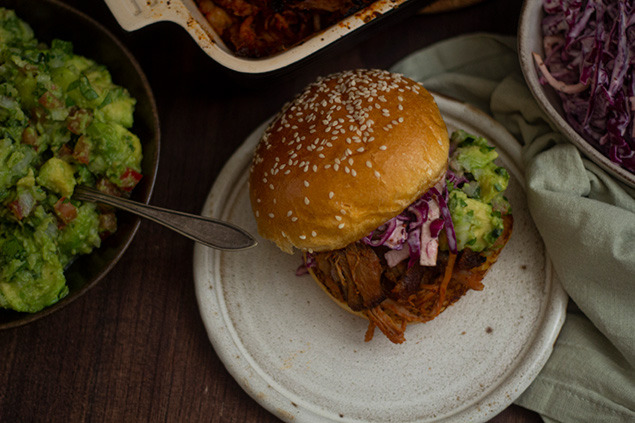 - När 4 h har gått kan du låta köttet vila i ugnen i 2 h innan du drar isär köttet med två gafflar. När köttet är isärdraget kan du blanda det i vätskan från köttet och värma på det i ugnen igen med eventuella rester av rubben sprinklad över för ytterligare karamelliserad yta.